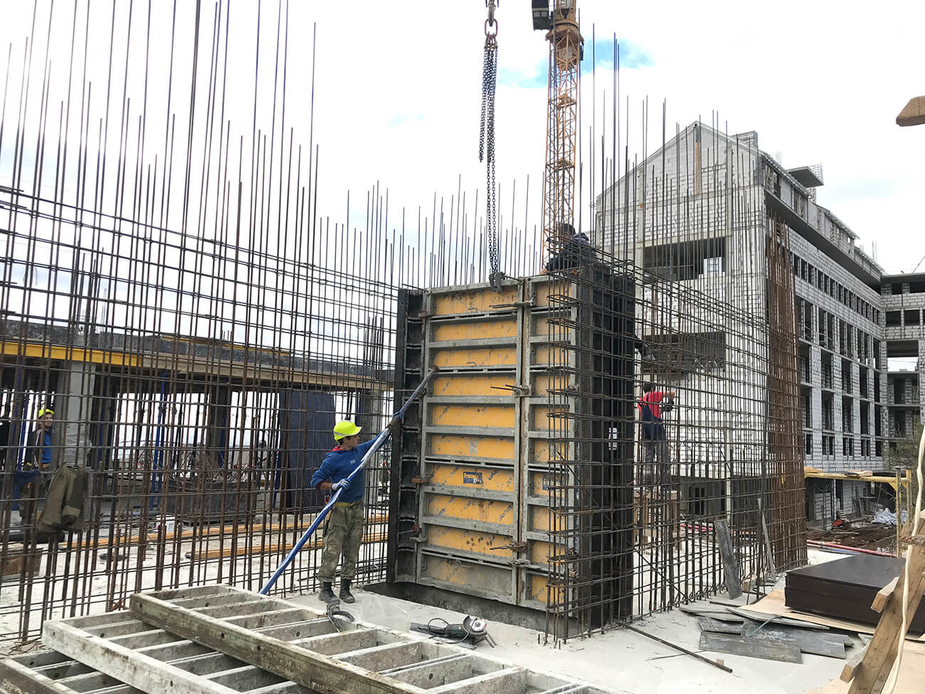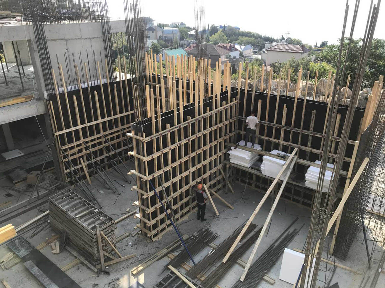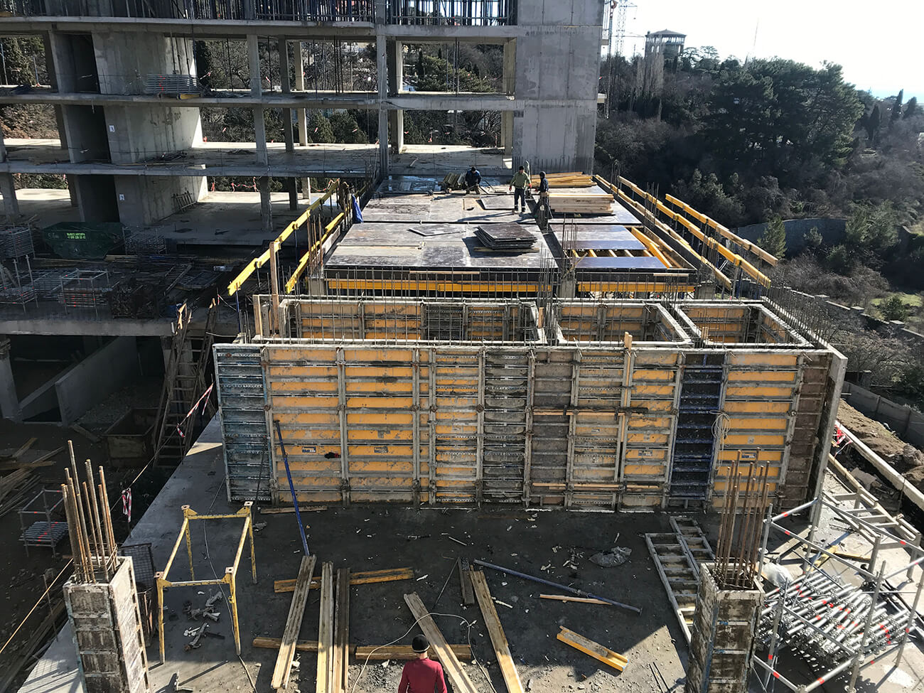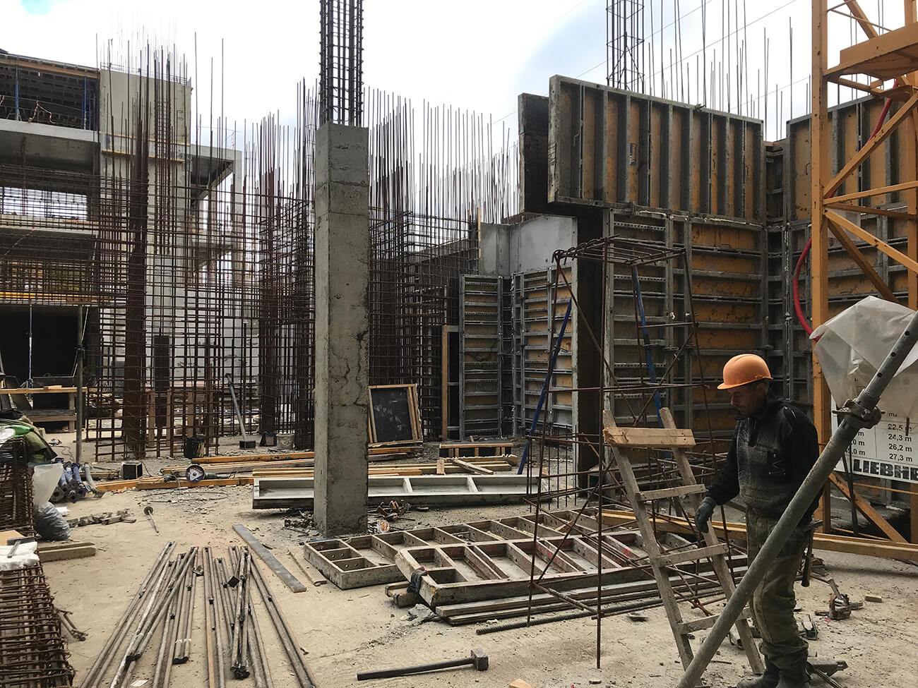 забетонированы перекрытие 4 этажа, колонны и стены 5 этажа, ставится опалубка и армируется перекрытие 5 этажа;