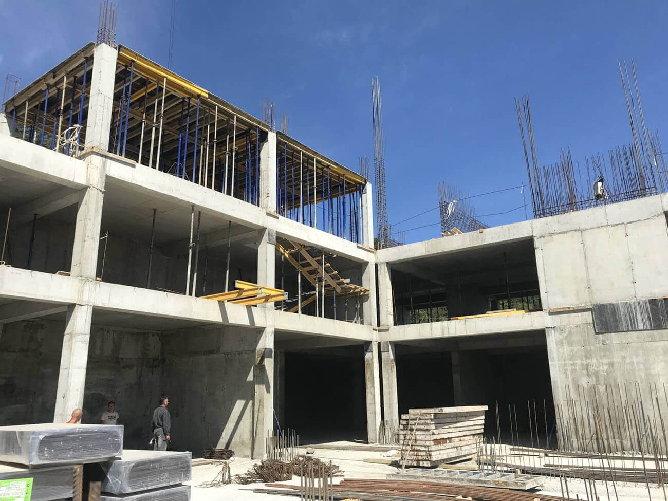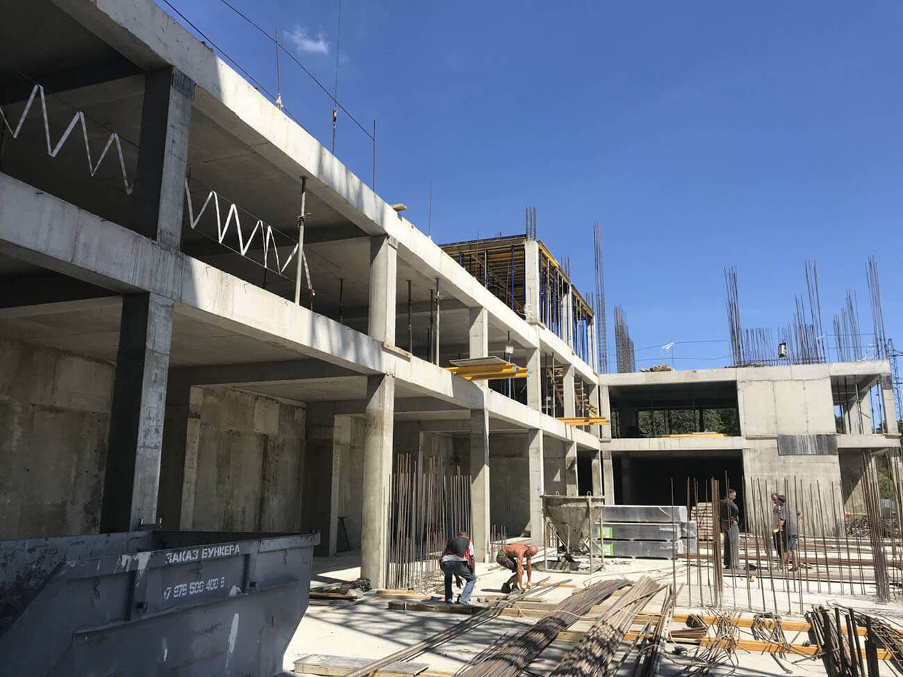 На сегодняшний день уже завершены работы по бетонированию блока 2.1 до отметки 1 этаж и по устройству стен перекрытий 2-го этажа блоков 1 и 1.1 В процессе выполнения: