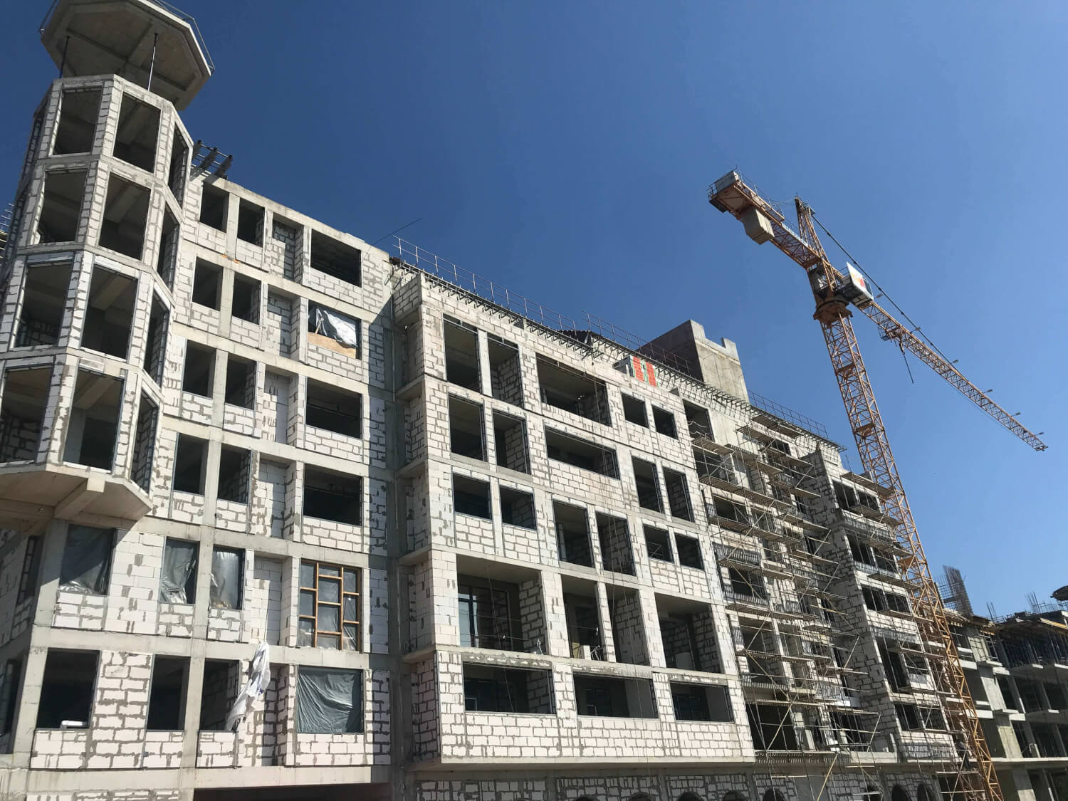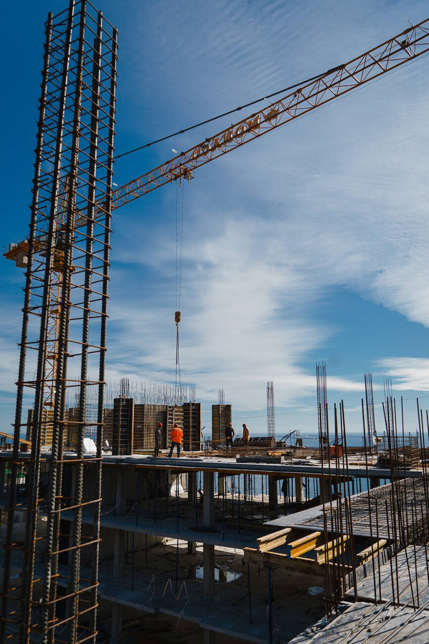 Ключевой этап строительства первых двух блоков жилого комплекса подходит к концу. С каждым днем здание стремительно растет ввысь. Работы на строительной площадке ведутся стабильно и по графику.